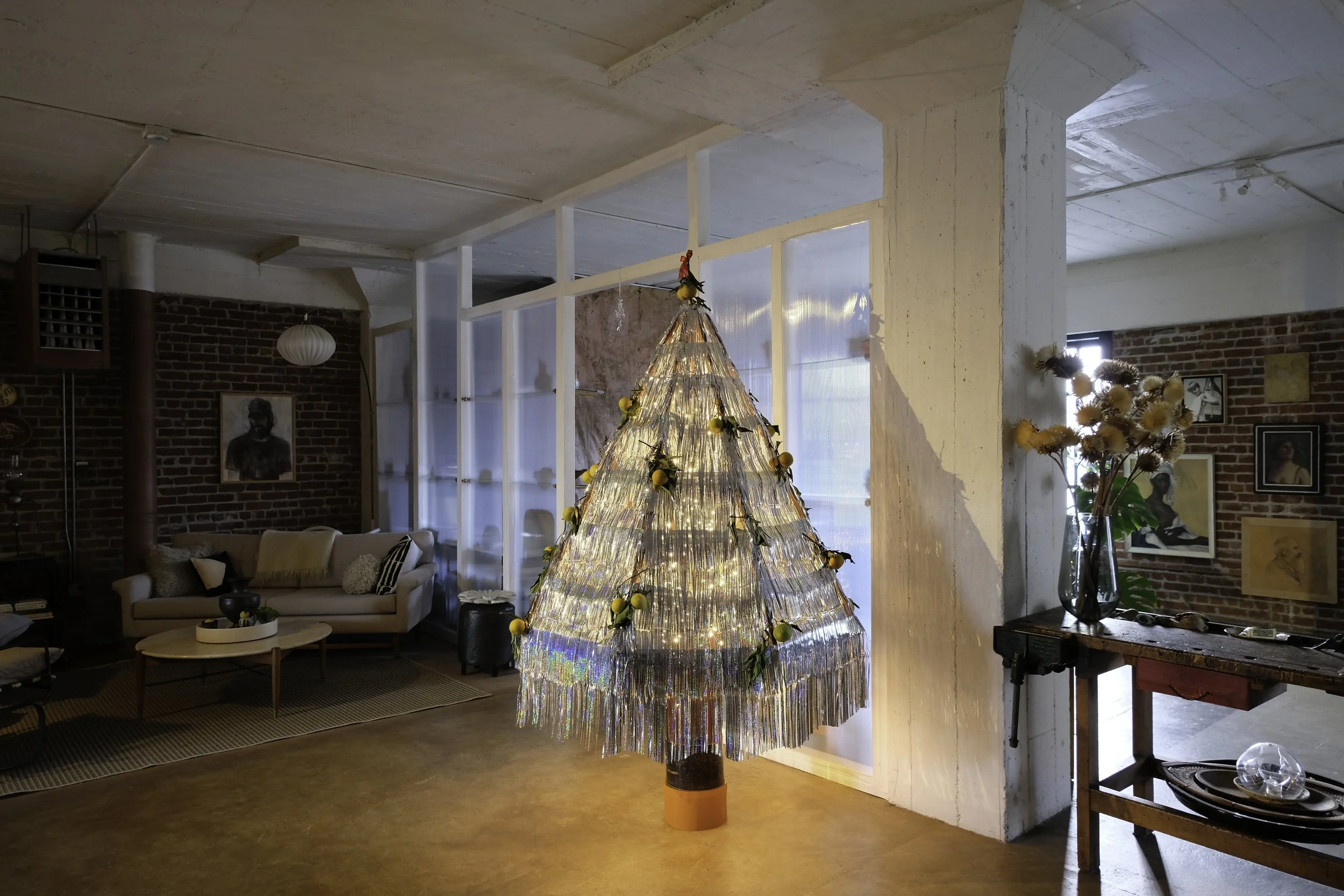 2025’s hand-made tree: salvaged patio umbrella armature covered in tinsel garlands and citrus. What’s more festive than that?